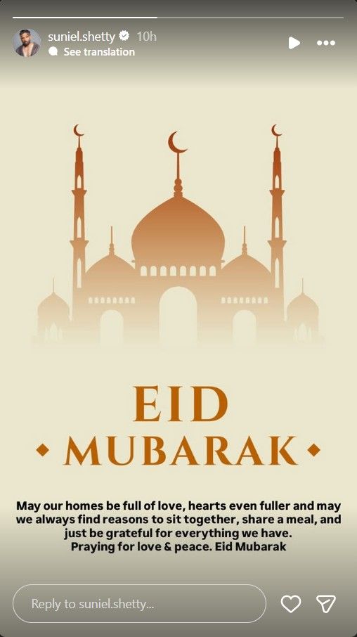 Suniel Shetty also wished his fans with a special message on the festivity, "May our homes be full of love, hearts even fuller, and may we always find reasons to sit together, share a meal, and just be grateful for everything we have. Praying for love & peace. Eid Mubarak."